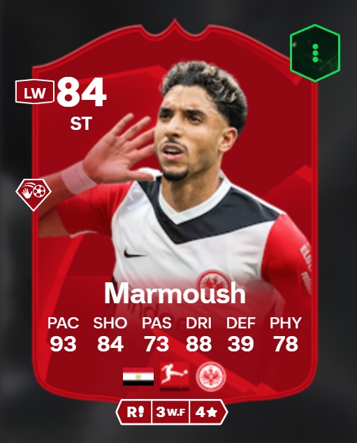 وتأتي البطاقة مع أربع نجوم للمراوغة وثلاث نجوم للقدم الضعيفة، مما يجعله قادرًا على اللعب بمرونة في الثلث الأخير من الملعب. بفضل سرعته العالية ومهارته في المراوغة، يستطيع مرموش التفوق على المدافعين وخلق فرص هجومية خطيرة.