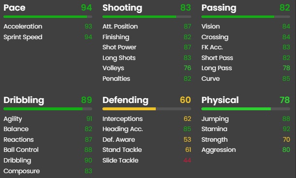 رافينيا يتميز بالسرعة العالية والمراوغة، مما يجعله مثاليًا للاختراقات السريعة من الأجنحة، إضافة إلى أنه يمتلك تسديدات جيدة في مواقف الهجوم. كما أنه قادر على اللعب بانفجار حركي كبير بفضل تصنيفه “Mostly Explosive” مما يعزز من سرعته وقوته في الملعب.