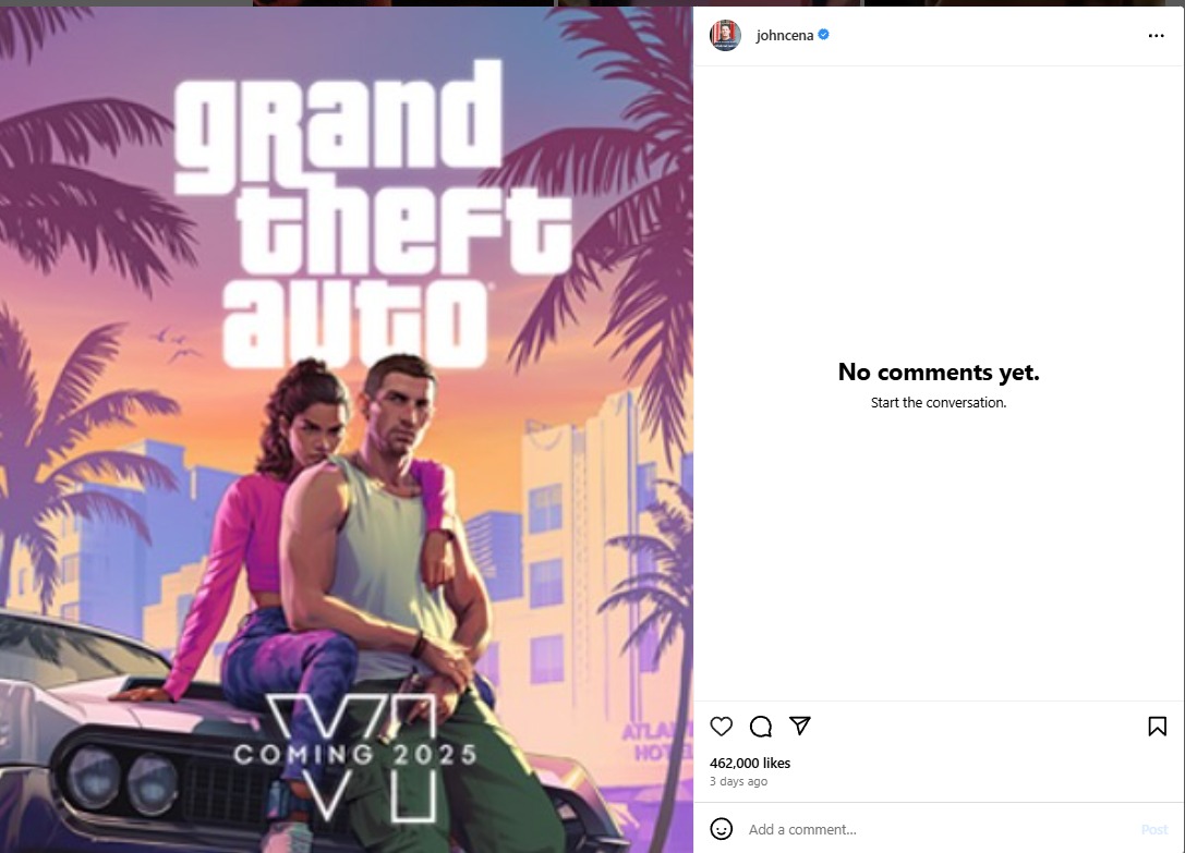 بعد ساعات فقط من هذا التحول الدرامي، نشر جون سينا صورة للعبة GTA 6 على حسابه في إنستاجرام، وهو ما أثار موجة من التكهنات حول سبب هذا المنشور. لمن لا يعرف، فإن اللاعبين حول العالم صنعوا ميمًا شهيرًا يسخر من الأشياء غير المتوقعة التي تحدث قبل الإعلان عن Grand Theft Auto 6، نظرًا لأن الانتظار دام 12 عامًا.