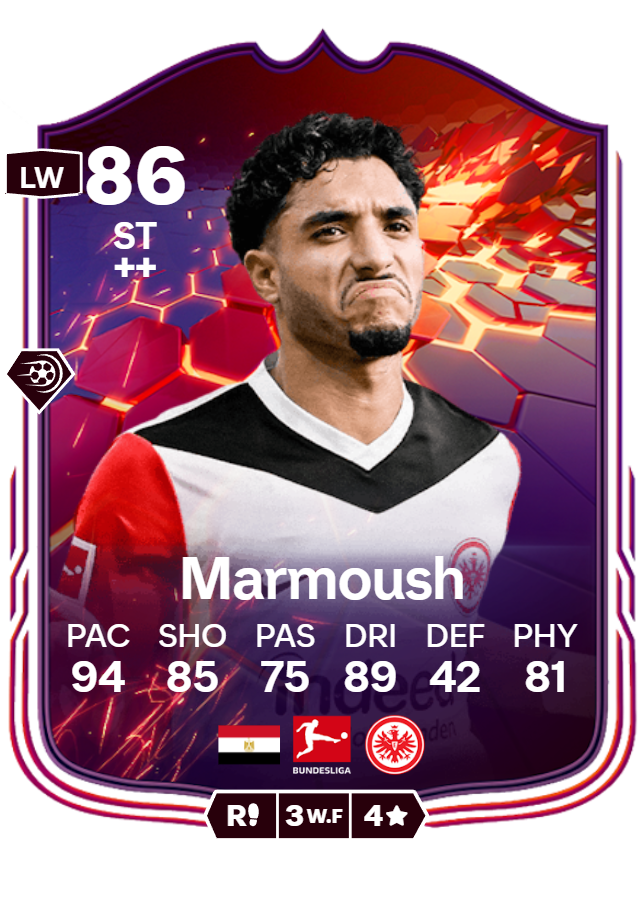 عمر مرموش، اللاعب المصري المحترف الذي يلعب في مركز الهجوم لنادي فرانكفورت الألماني في الدوري الألماني (البوندسليغا)، يواصل إثارة اهتمام عشاق لعبة FC25 ببطاقته المميزة التي تحمل تقييمًا قويًا وقدرات هجومية مبهرة.