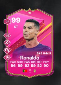 توافرت بطاقة البرتغالي كرستيانو رونالدو لاعب فريق النصر السعودي في تحديات لعبة FC24 بطاقات 99. البطاقة من نوع بطاقات “PREMIUM”، وهي البطاقة التاسعة للاعب حتى الأن باللعبة. وتوافر رونالدو في